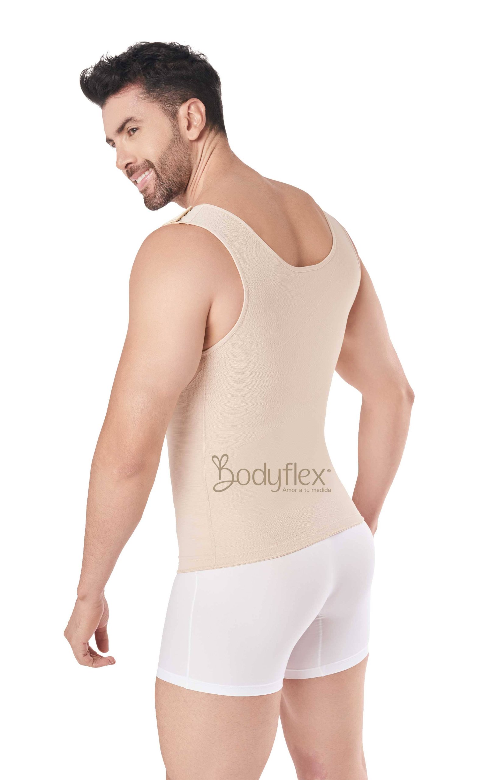 Chaleco color beige con espalda semicubierta, abrochadura en hombros, abrochadura por cuatro posiciones en la zona abdominal y corrector de postura.