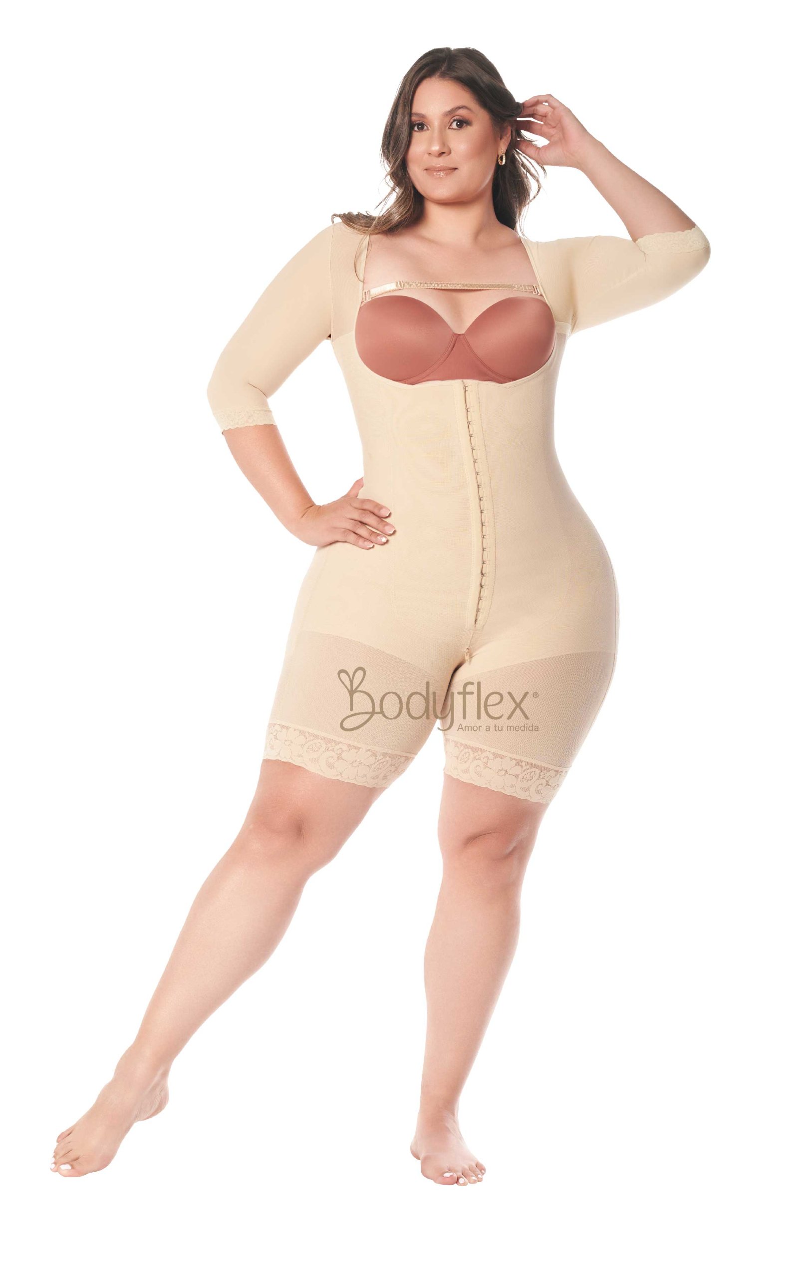 La faja color beige con espalda cubierta, senos libres, manga tres cuartos, refuerzo abdominal, banda levanta glúteos y cierre inferior es el aliado ideal para quienes buscan soporte físico y estilización en su rutina diaria. Diseñada para adaptarse perfectamente al cuerpo, esta prenda equilibra funcionalidad y comodidad, ofreciendo una experiencia única que te hará sentir confiada y segura.