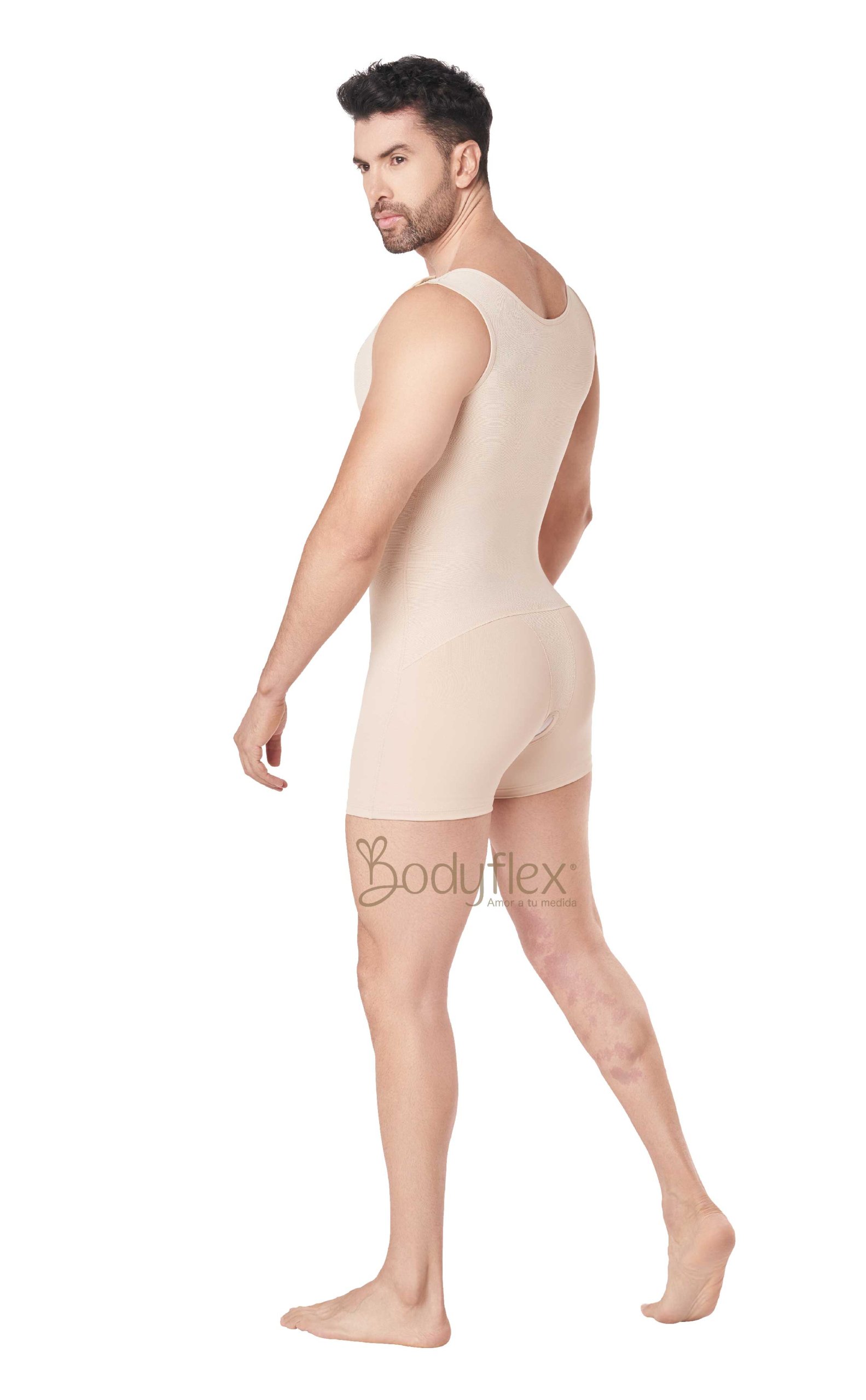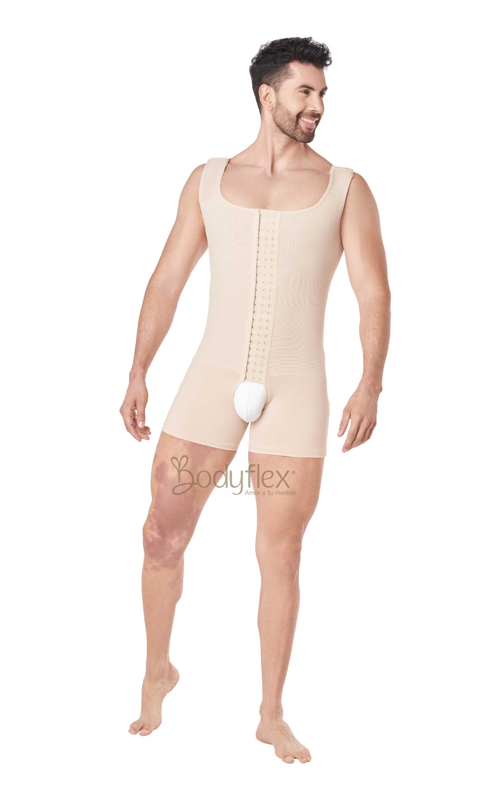 Faja color beige con espalda semicubierta, abrochadura en hombros, abrochadura por cuatro posiciones en la zona abdominal y abertura perineal.